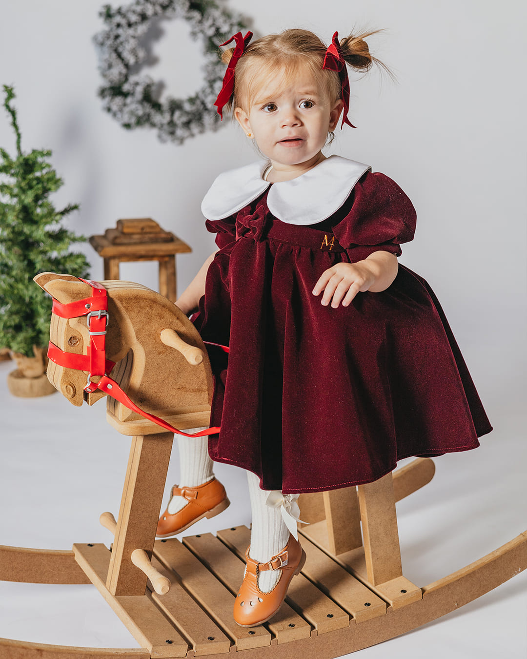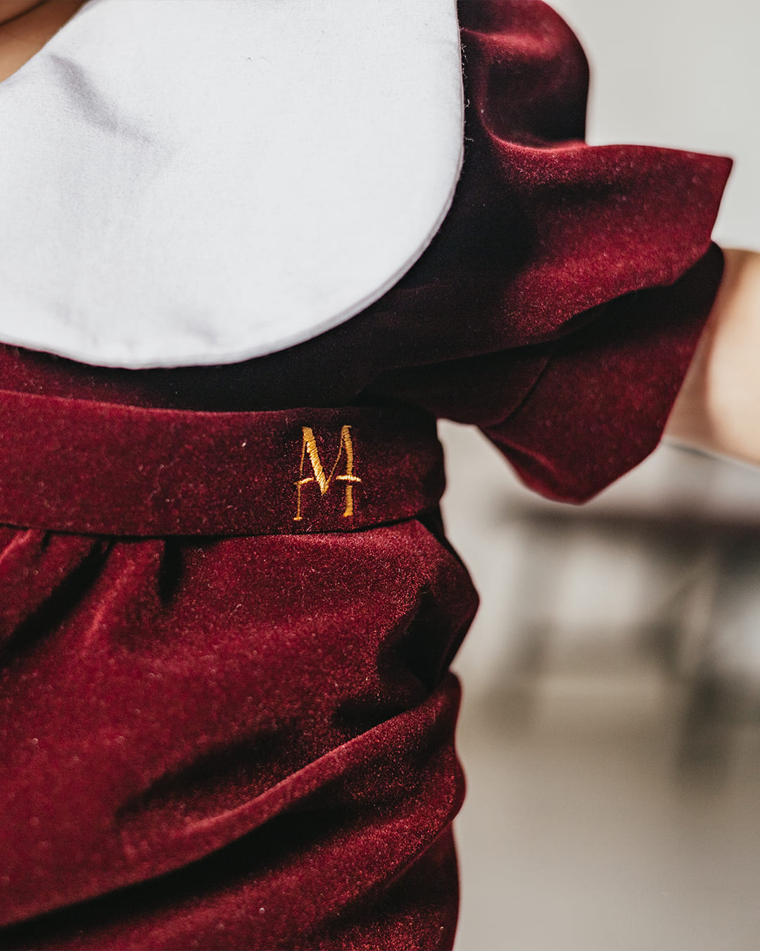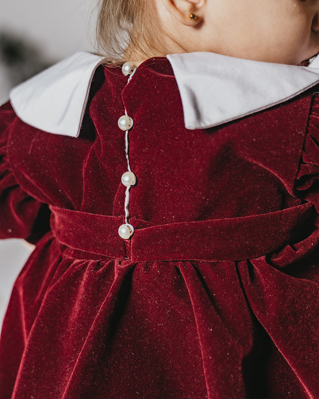 Elegantna haljina od mekanog pliša, bez elastina, idealna za svečane prilike. Kragna je izrađena od finog piplina, dok kratki puf rukavi dodaju nježan, djevojački šarm. Diskretna mašna na prednjem dijelu uparena s pojasom ističe struk, a kopčanje na četiri biserna gumba upotpunjava sofisticirani izgled haljine.