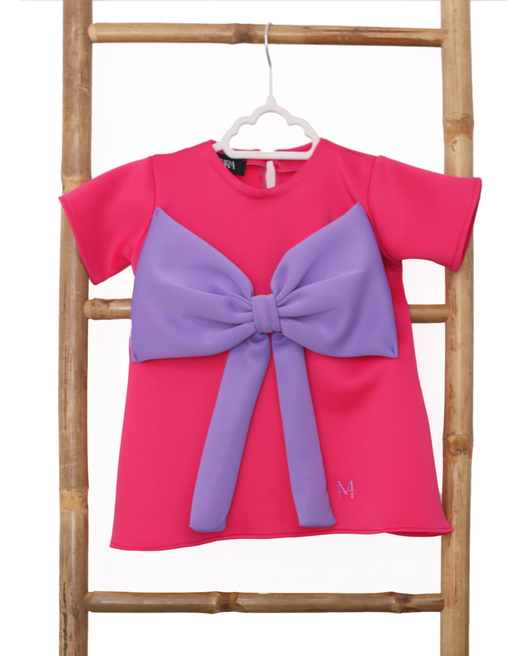 Haljina klasičnog A kroja s kratkim rukavima, idealna za svečane prilike i posebne trenutke. Prednji dio krasi velika dekorativna mašna koja daje profinjen i razigran izgled. Na poleđini se nalazi jednostavno kopčanje na jedan gumb za praktično oblačenje.