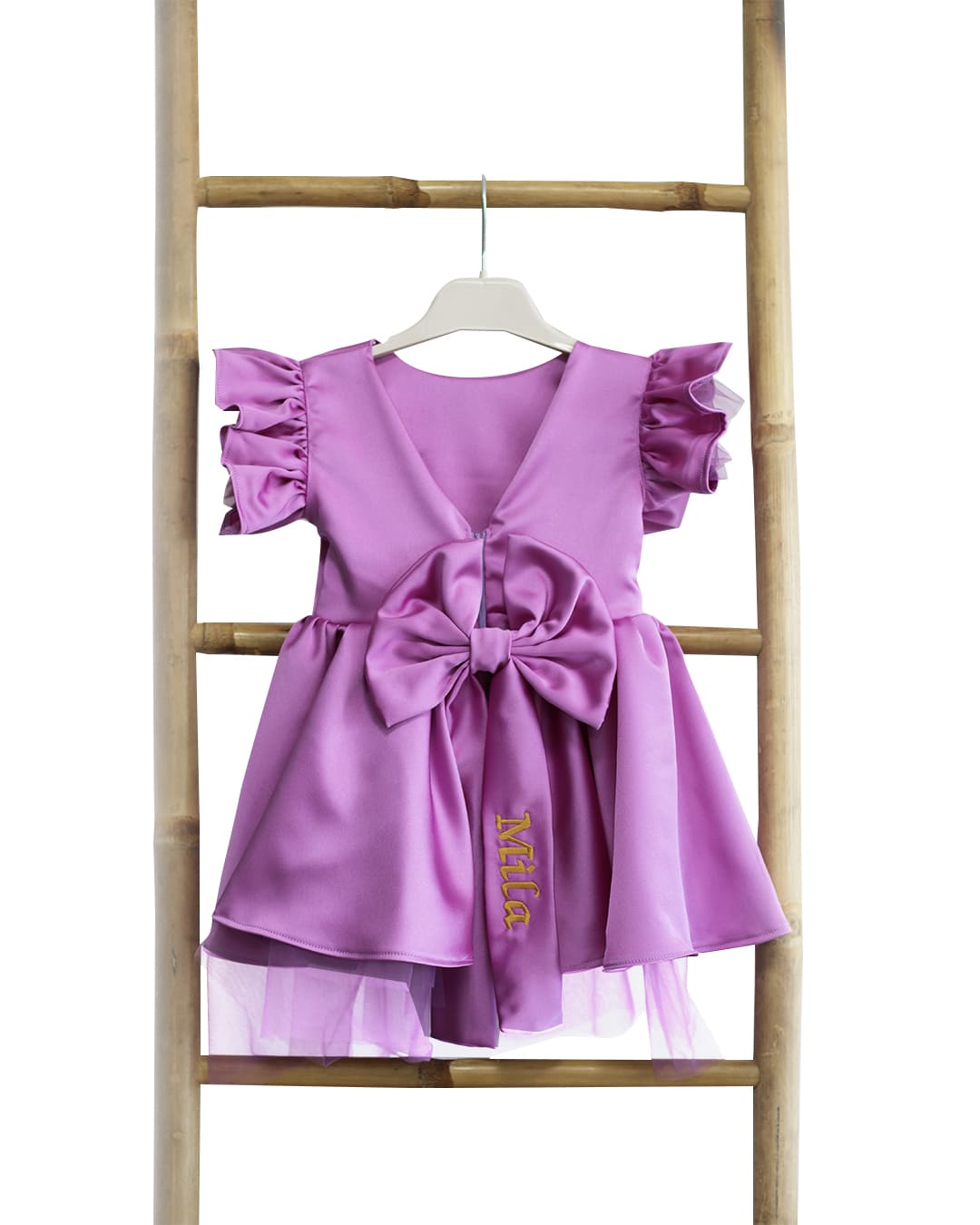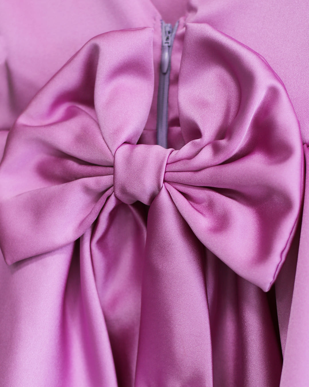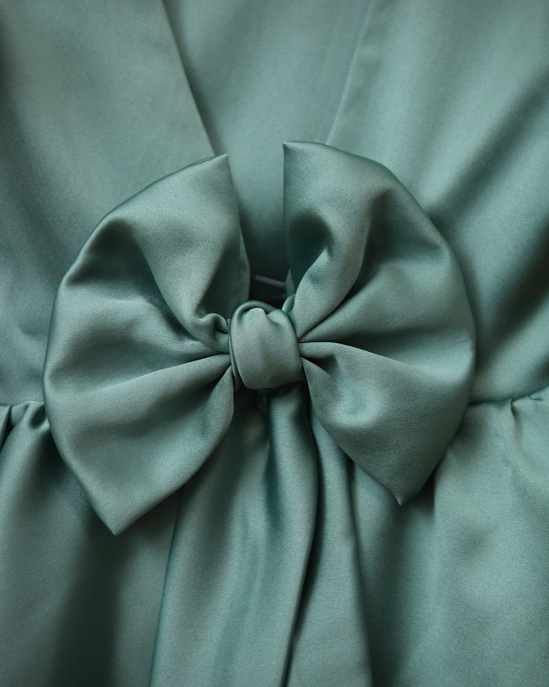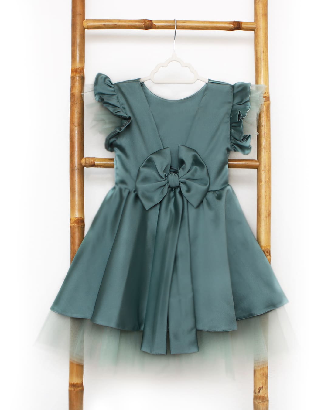 Što daju saten i til u kombinaciji? Cinderella savršenstvo. Ljetna haljina kratkih rukava sa V izrezom na pozadini koga ukrašava elegantna mašna od istog materijala.