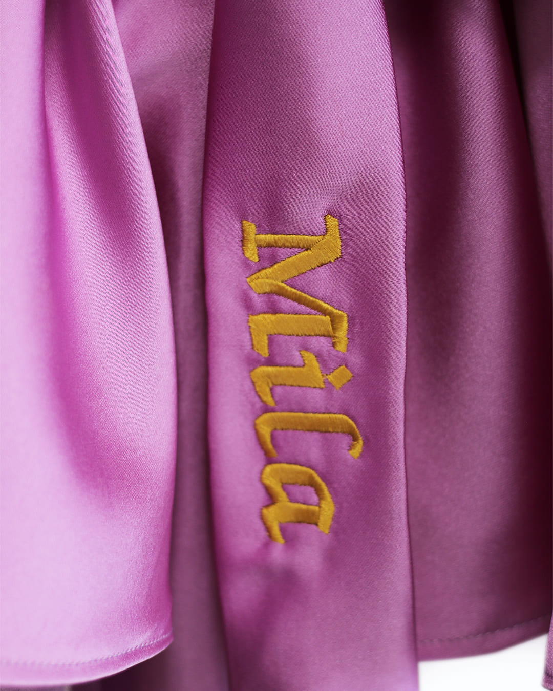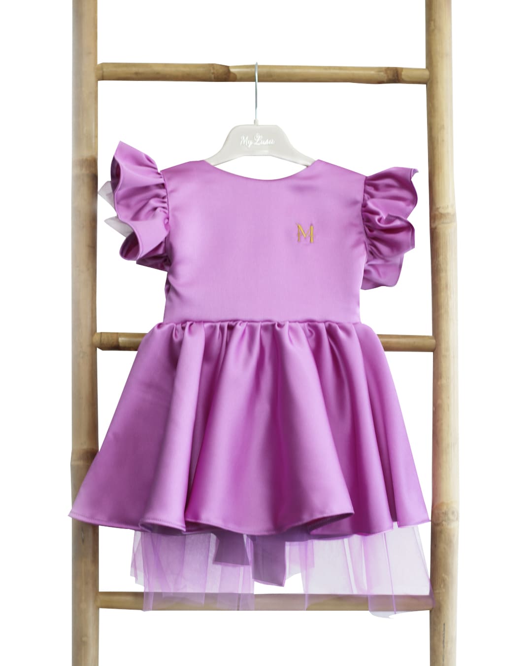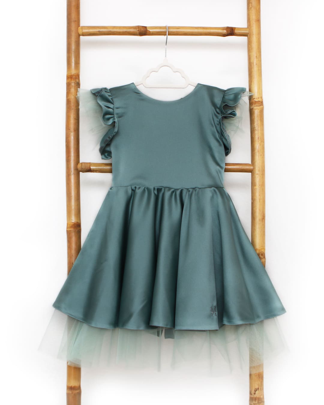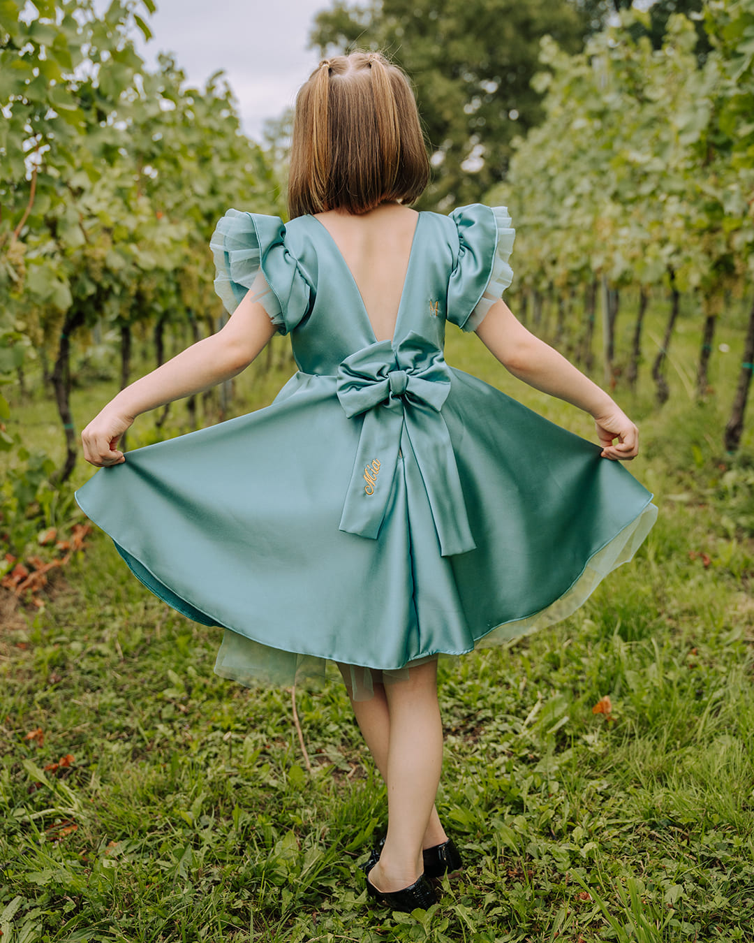 Što daju saten i til u kombinaciji? Cinderella savršenstvo. Ljetna haljina kratkih rukava sa V izrezom na pozadini koga ukrašava elegantna mašna od istog materijala.
