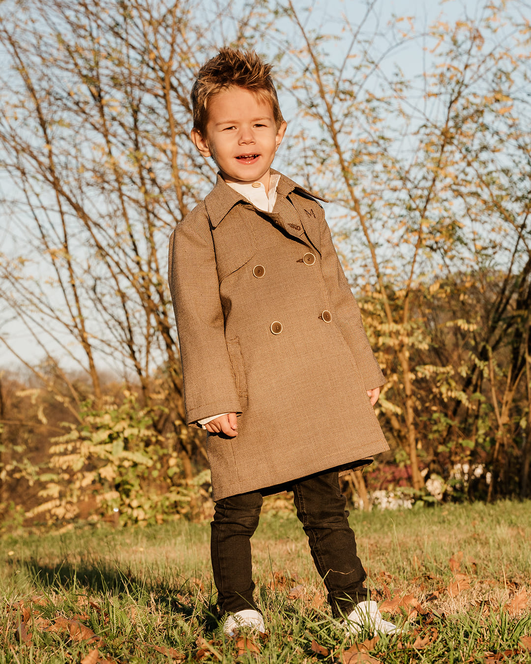Kaput izrađen od sitnog pepito štofa donosi klasičan uzorak u modernom i profinjenom izdanju. Dvoredno kopčanje naglašava eleganciju kroja, dok kraći satlići sprijeda dodaju dašak strukture i urednosti.