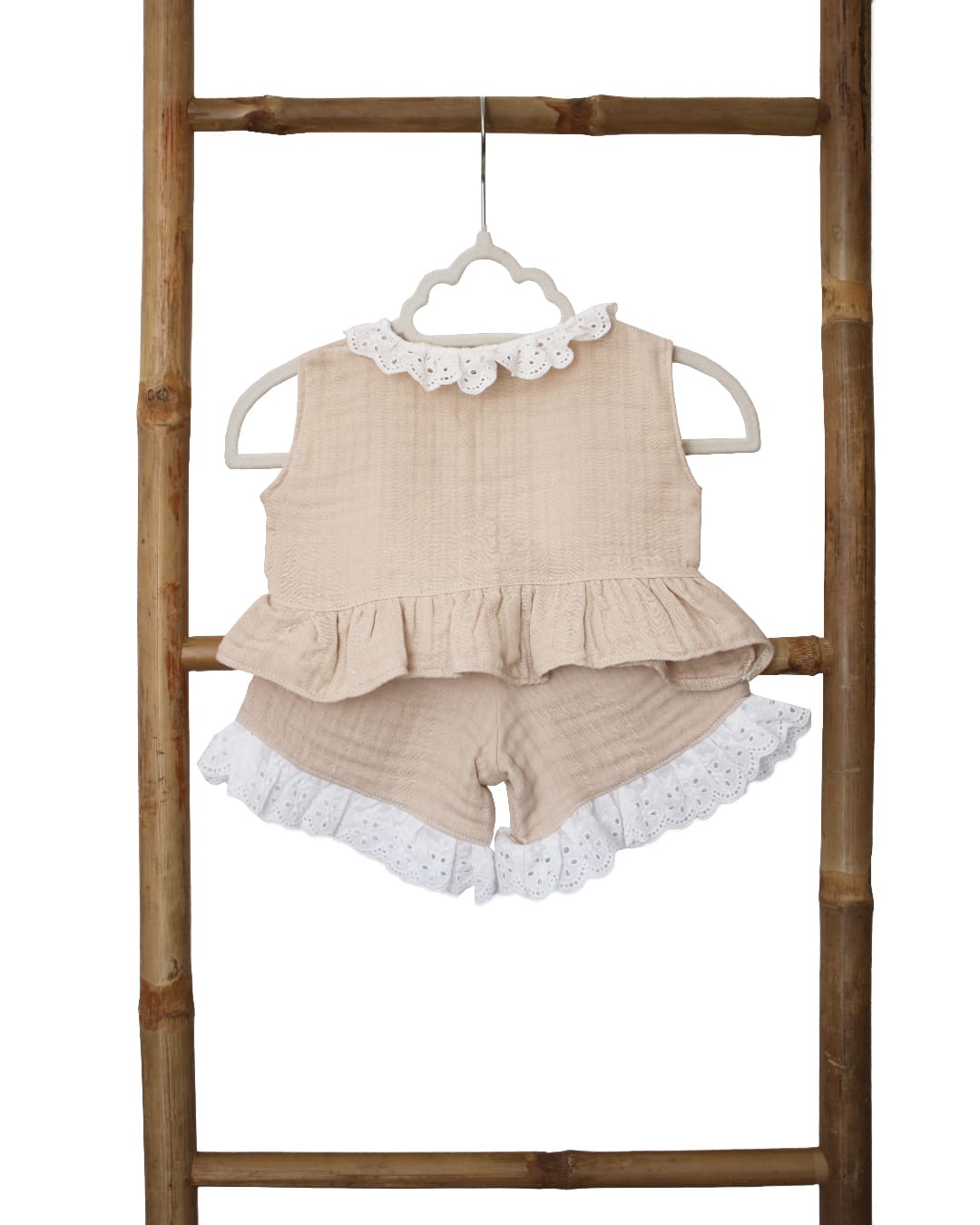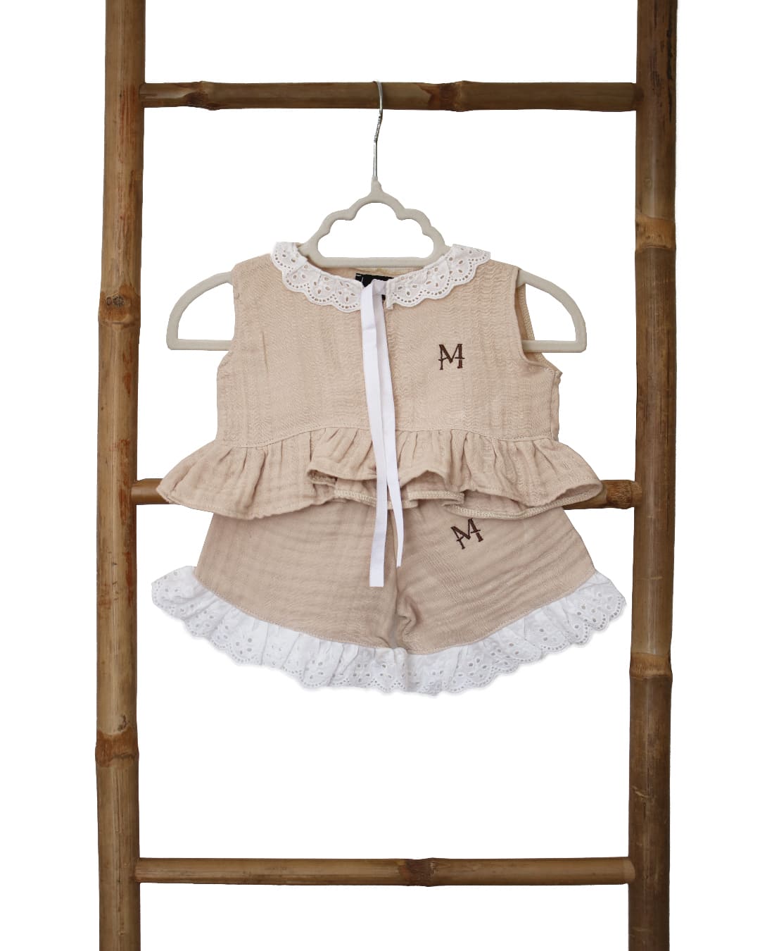 Nježan i prozračan komplet za prve dane bebe, izrađen od visokokvalitetnog muslina – 100% pamuk. Set sadrži majicu kratkih rukava s volanom na donjem rubu, čipkom oko otvora za glavu i dekorativnom špagicom za vezanje. Kapicu koja se veže ispod brade i šorc s mekanom elastičnom gumicom u struku.