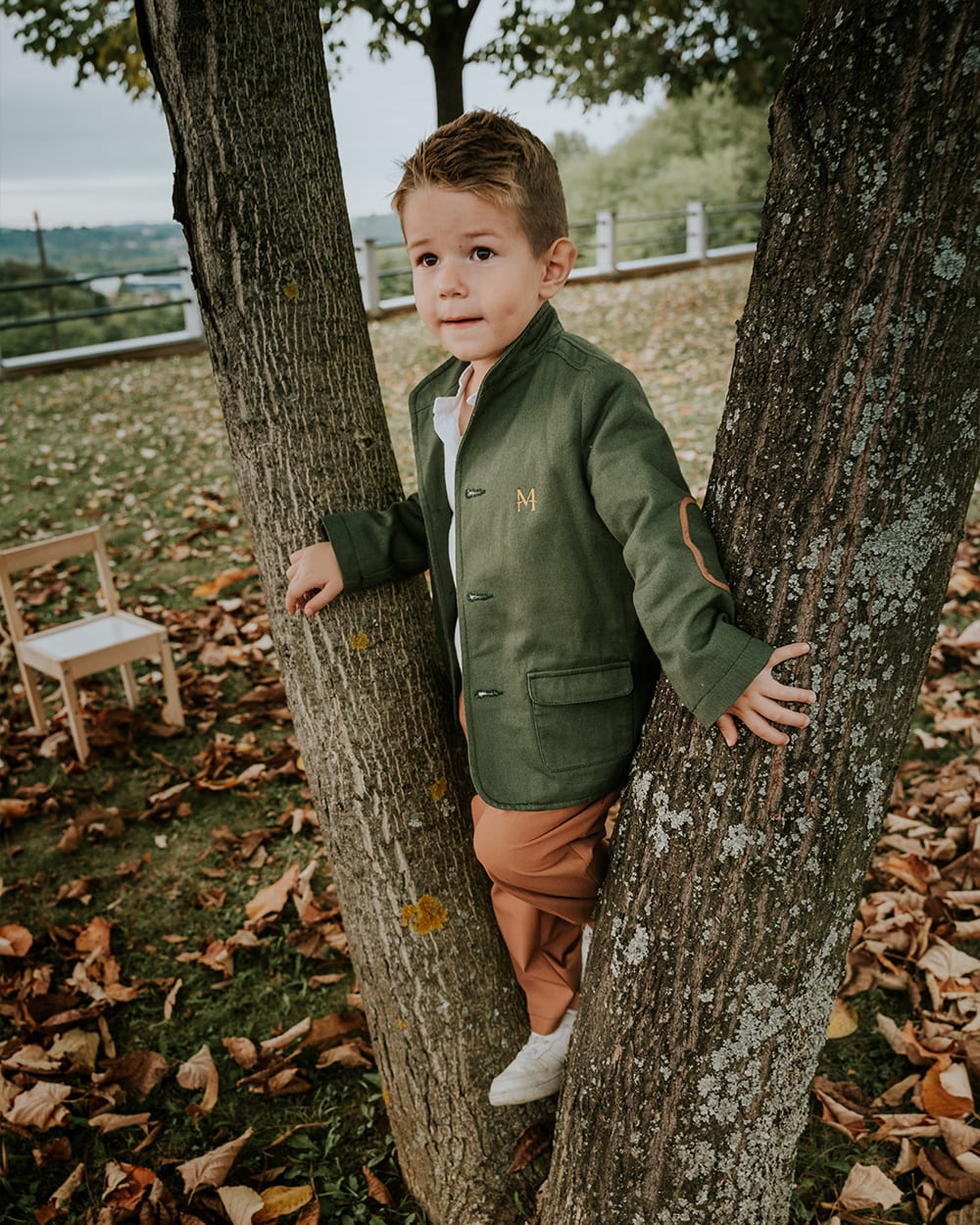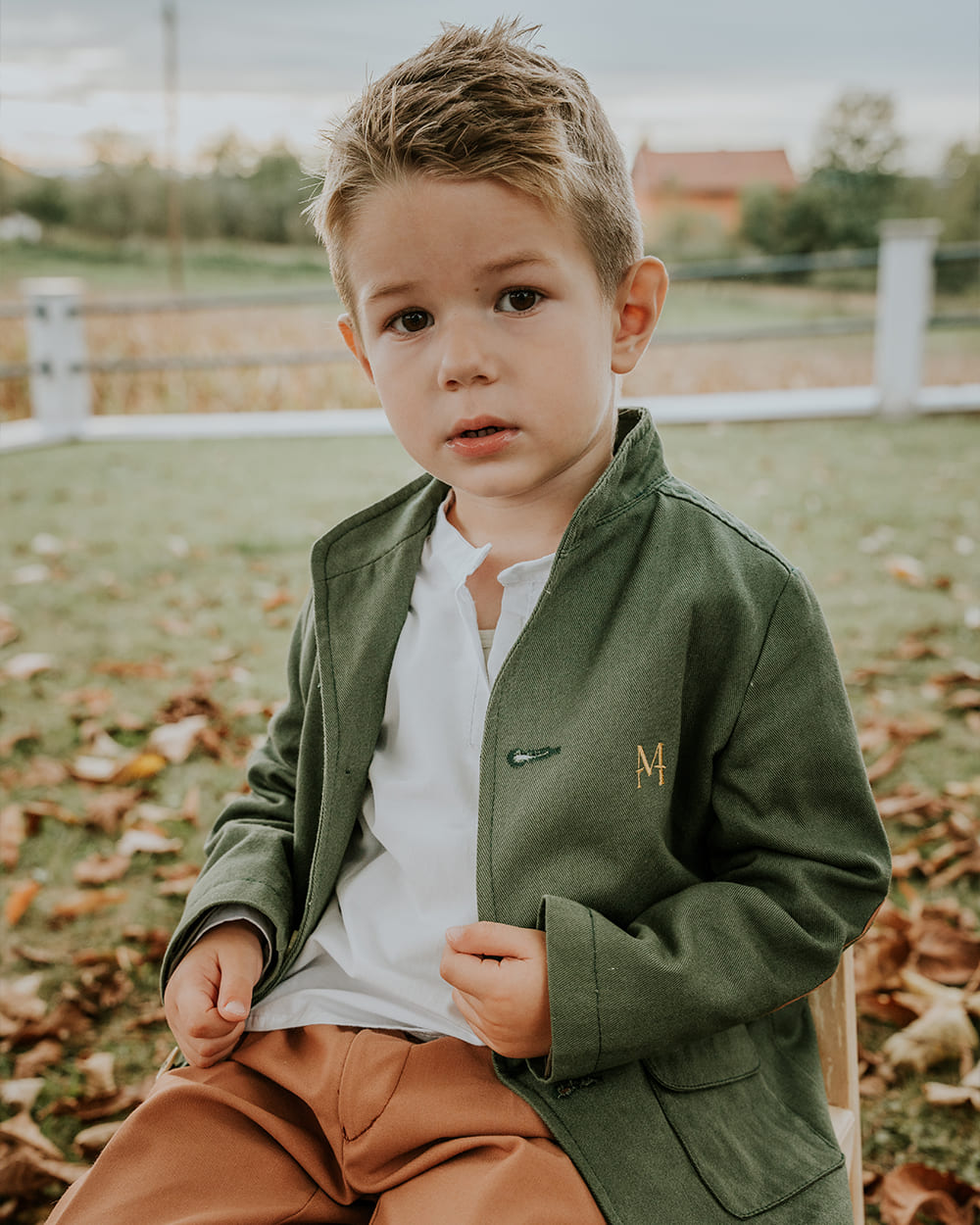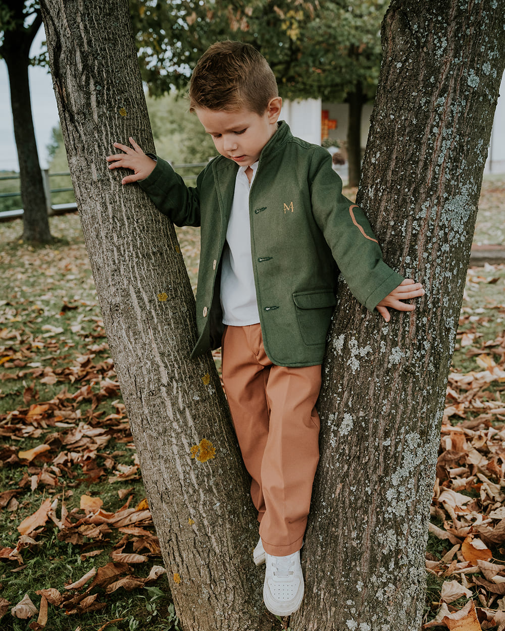 Sako od finog kepera, pažljivo krojen i upotpunjen sa četiri gumba za profinjen izgled. Hlače od mekanog štofa s funkcionalnim džepovima i kopčanjem na rajfešlus. Komplet koji odiše toplinom jeseni, dizajniran za trenutke igre, ali i za posebne prilike koje traže dašak elegancije.